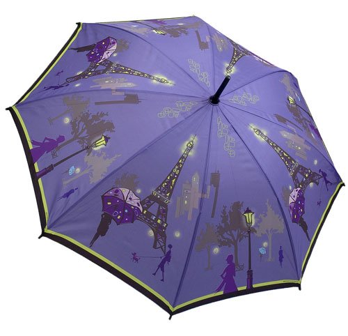 This is an elegant Ladies Stick Umbrella with a print of the Eiffel Tower at night. It has the artwork printed and repeated around the canopy. Fully automatic folding with the touch of the button on the handle. Virtually unbreakable fibreglass ribs. Black plastic compact handle. 32cm length. 102cm span when open. Gift Boxed.